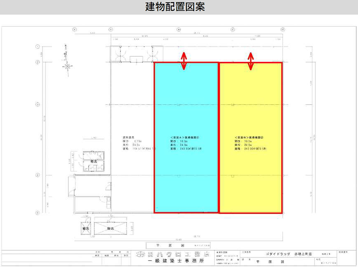 | 仮に2区画で想定しています。建築面積・家賃・保証金はご相談に応じますので、お問い合わせください。 |