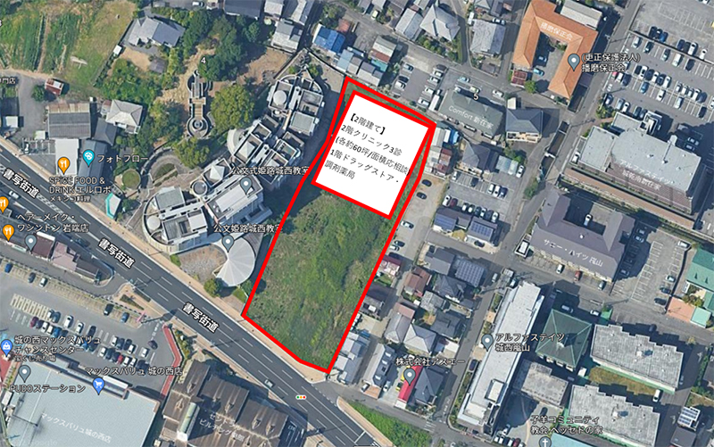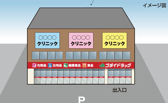 | 2階建ての2階にクリニック3診療で想定しています。(1階はドラッグストア・調剤薬局)建築面積・家賃・保証金はご相談に応じますので、お問い合わせください。 |