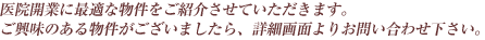 まずはクリニックを見学していただき、是非検討していただきたい物件です。 |